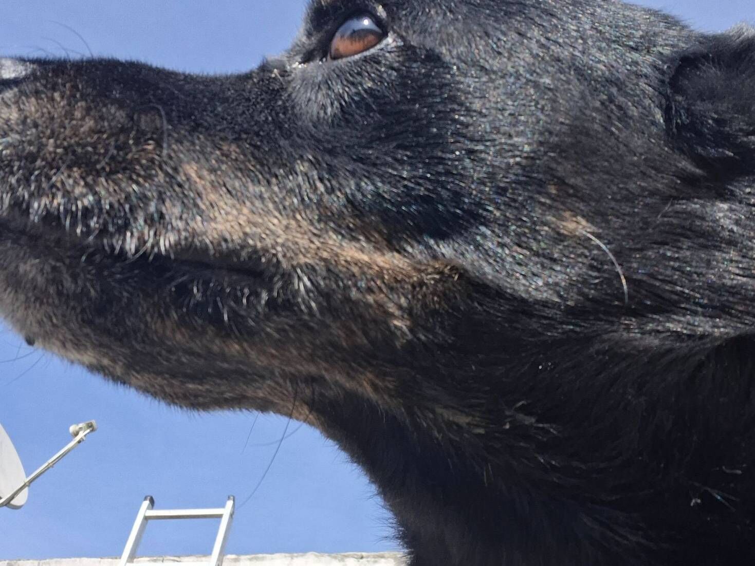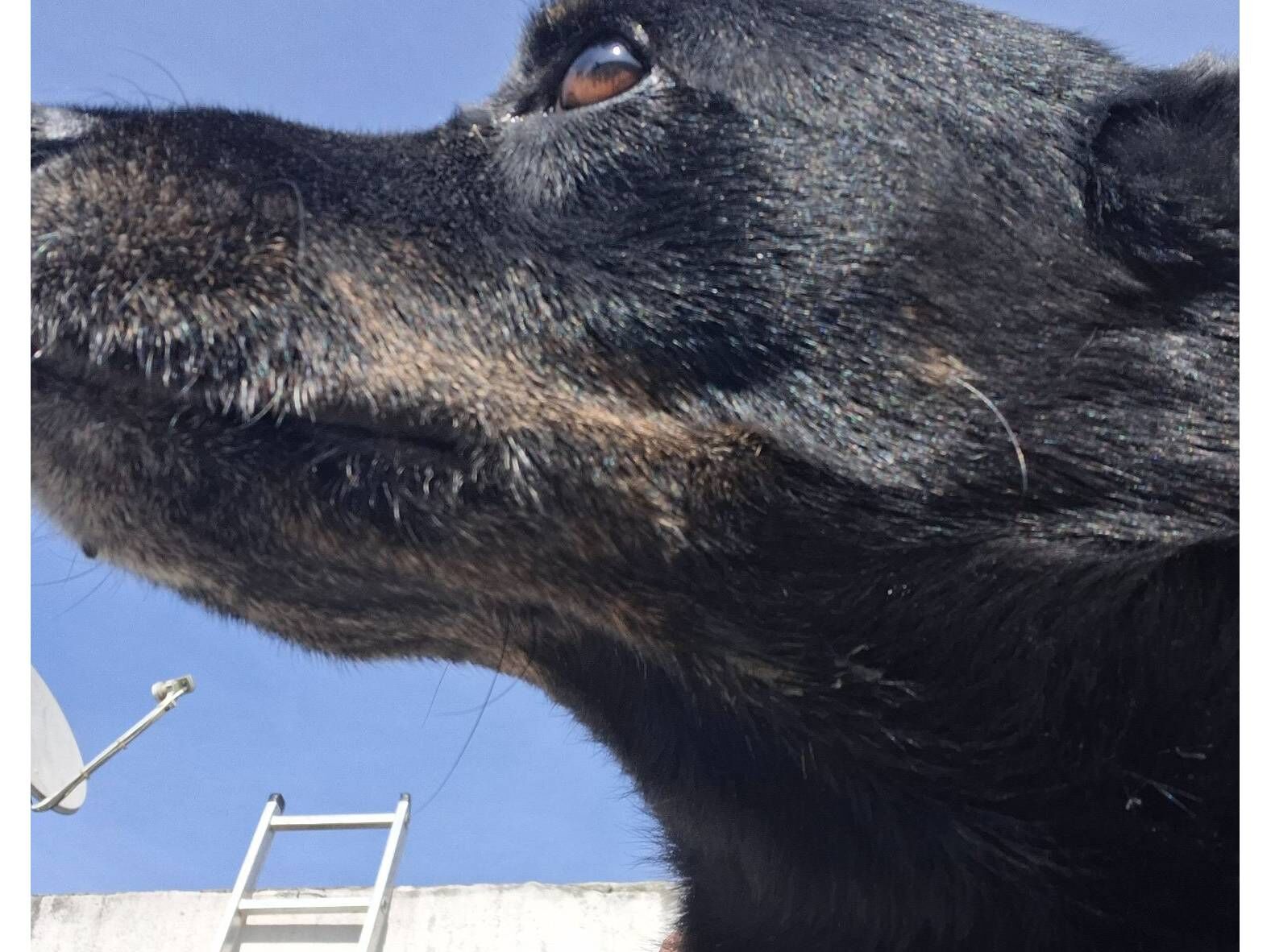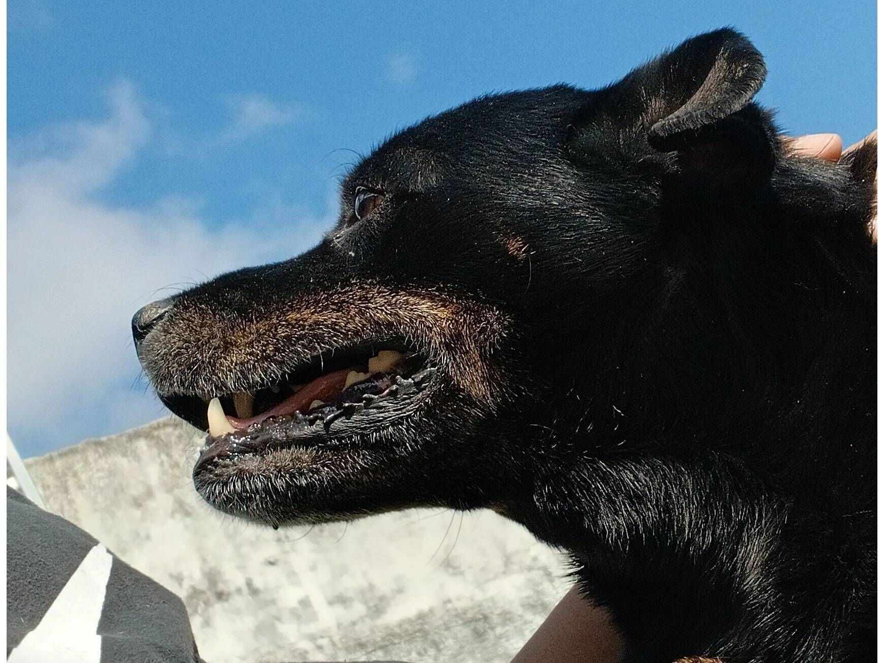 Cachorro preto, com patas douradas, médio porte cerca de 9-10 anos, brincalhão e energético