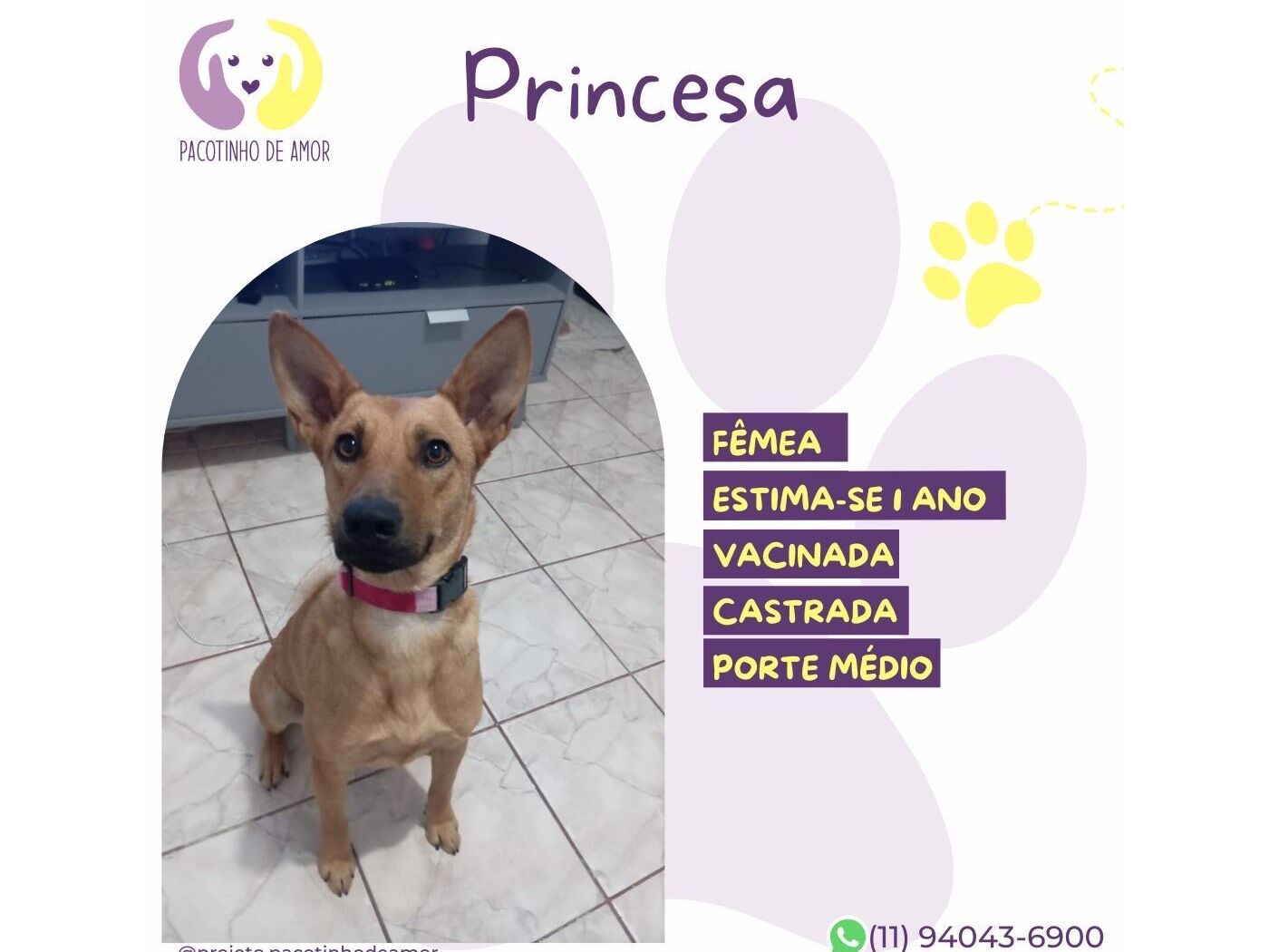 Obs.: Não reservamos animais. Não fazemos adoção por terceiros. Enviamos resposta para os perfis aprovados em até 3 dias úteis.