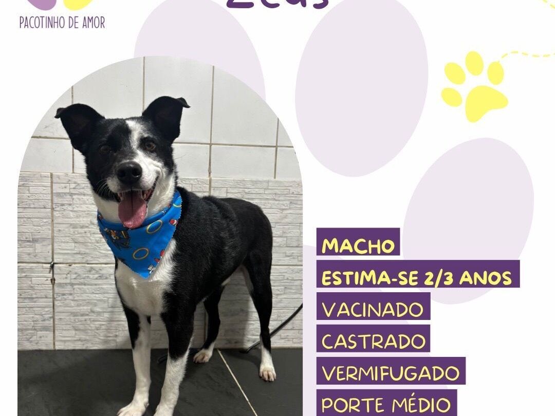 Zeus  Macho   Raça: SRD-ViraLata  Porte: Medio   Idade: 3 anos Pelagem: Branca/Preta