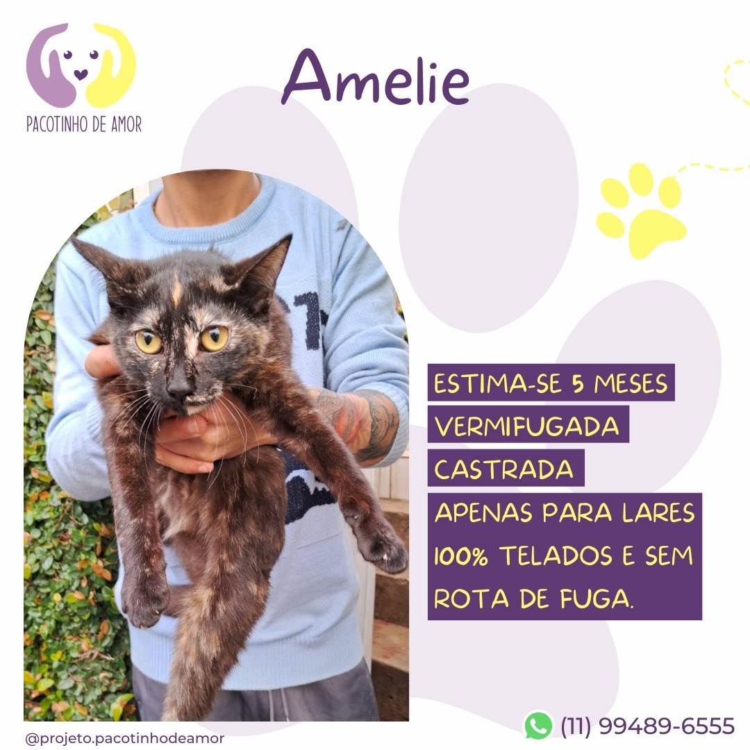 Amelie  Fêmea   Raça: SRD-ViraLata  Porte: Pequeno   Idade: 2 a 6 meses Pelagem: Rajada    Critérios para adoção