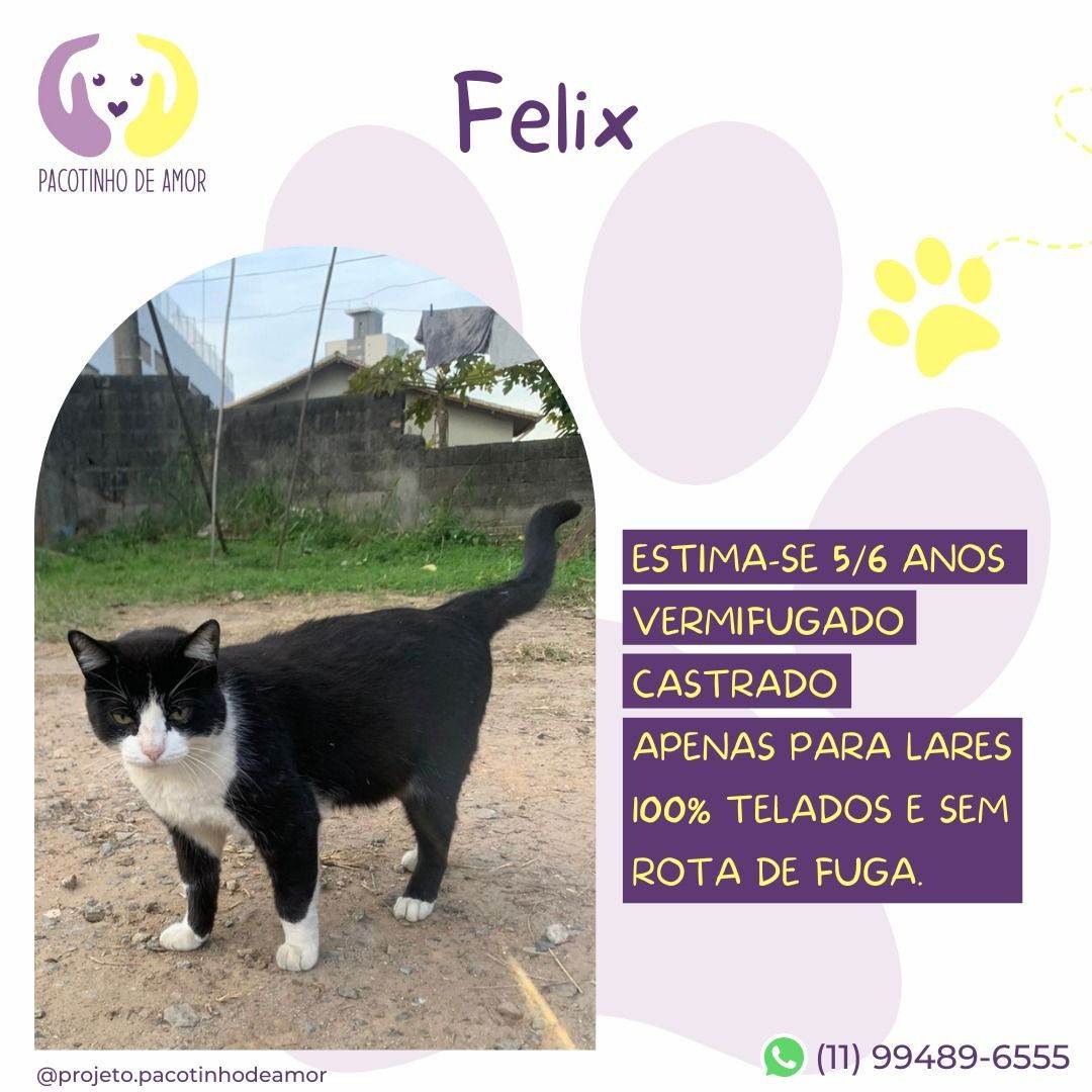 Felix  Macho   Raça: SRD-ViraLata  Porte: Pequeno   Idade: 6 anos Acima Pelagem: Branca/Preta    Critérios para adoção