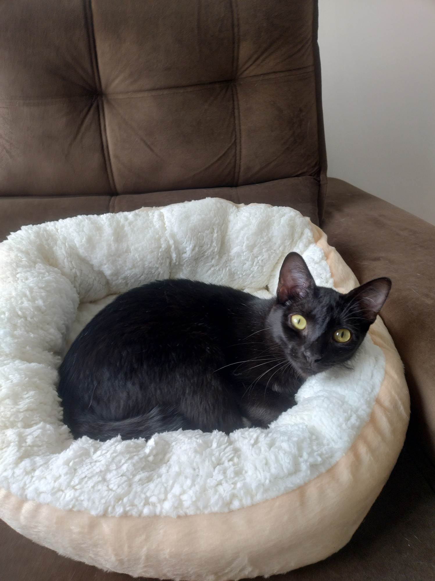 Apresentamos a encantadora Ramona, uma graciosa gatinha de 1 ano, da raça SRD-ViraLata, com uma pelagem preta que brilha lindamente. Ramona é de porte pequeno, mas seu coração é imenso. Desde que foi encontrada no estacionamento de um condomínio, mostrou-se amorosa e extremamente brincalhona. Ela adora brincar, mas também aprecia seus momentos de tranquilidade, onde pode relaxar e recarregar as energias.