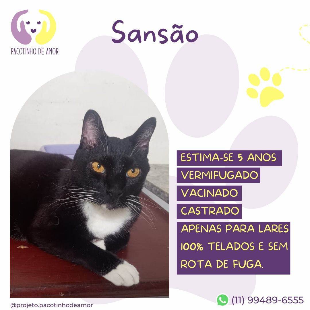 Sansão  Macho   Raça: SRD-ViraLata  Porte: Pequeno   Idade: 5 anos Pelagem: Branca/Preta    Critérios para adoção