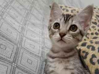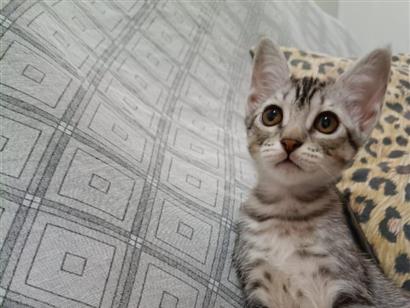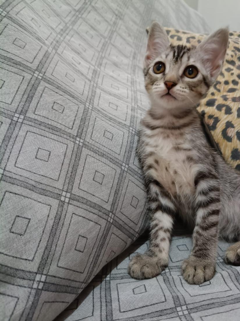 Com sua pelagem cinza listrada e olhos brilhantes, ela é uma verdadeira belezura. Já vermifugada e educada para usar a caixa de areia, está pronta para fazer parte da sua família! 🐾