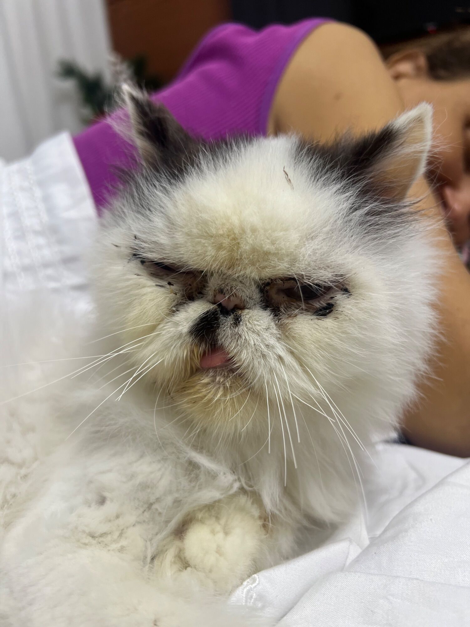 Gato persa branco com manchas cinzas, pintas pretas próximo a boca e nariz, dócil, atende por Lincoln