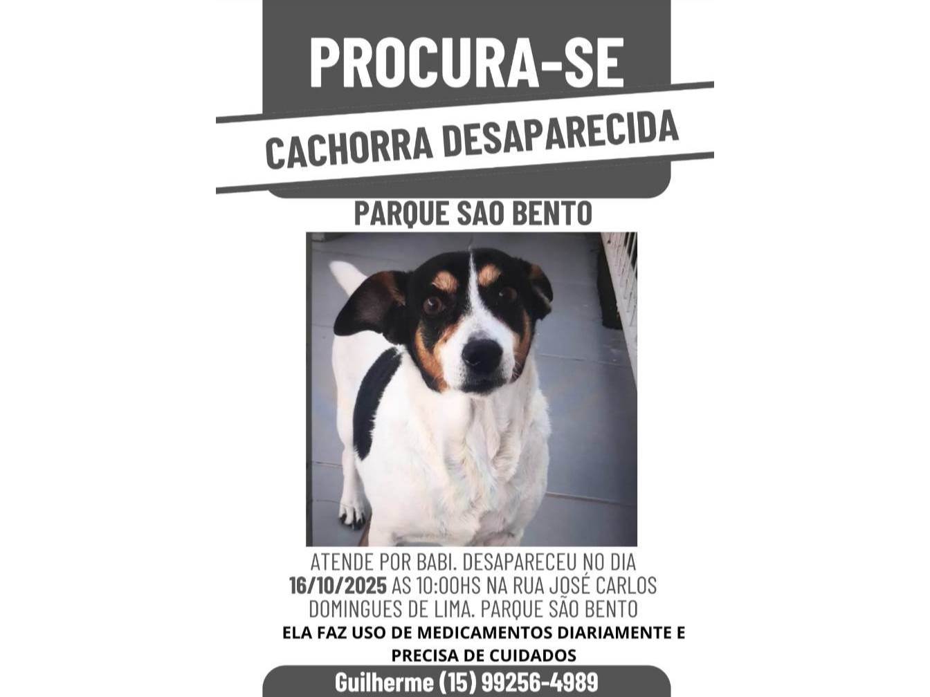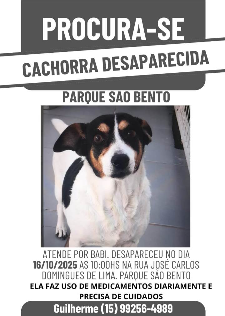 Babi está desaparecida desde 16/10/2025 no parque São Bento, possui 12 anos e é uma cachorrinha muito dócil, precisa de cuidados diários e medicamentos para o coração