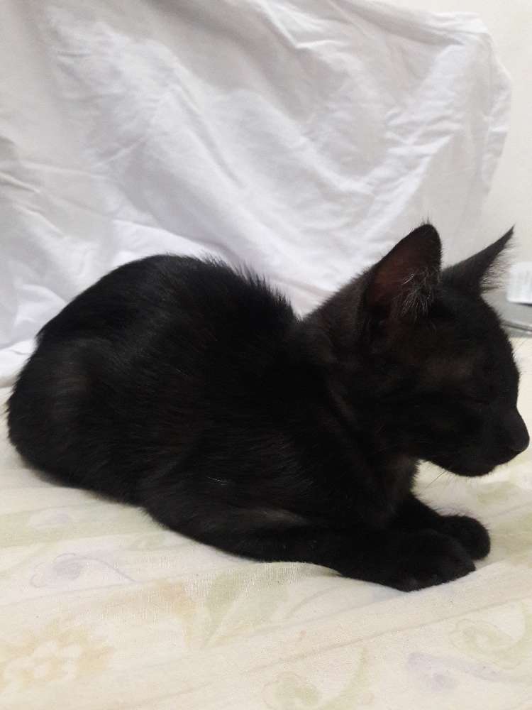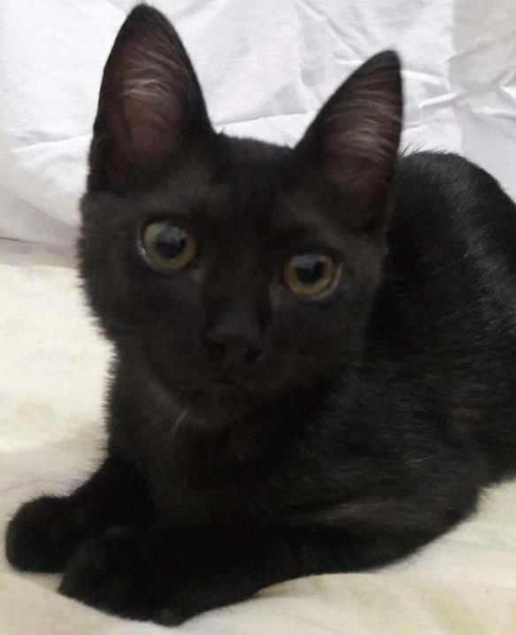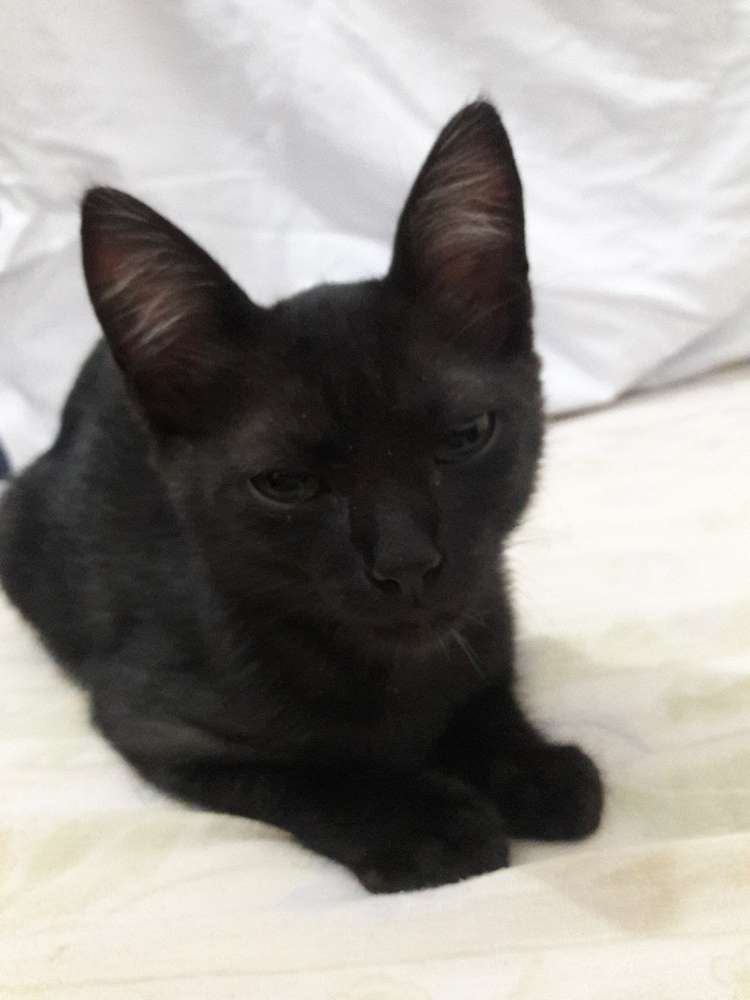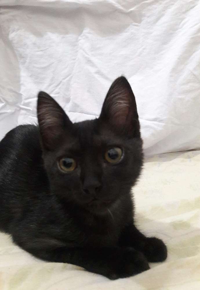 Ele é da cor preta com olhos verdes do porte pequeno.