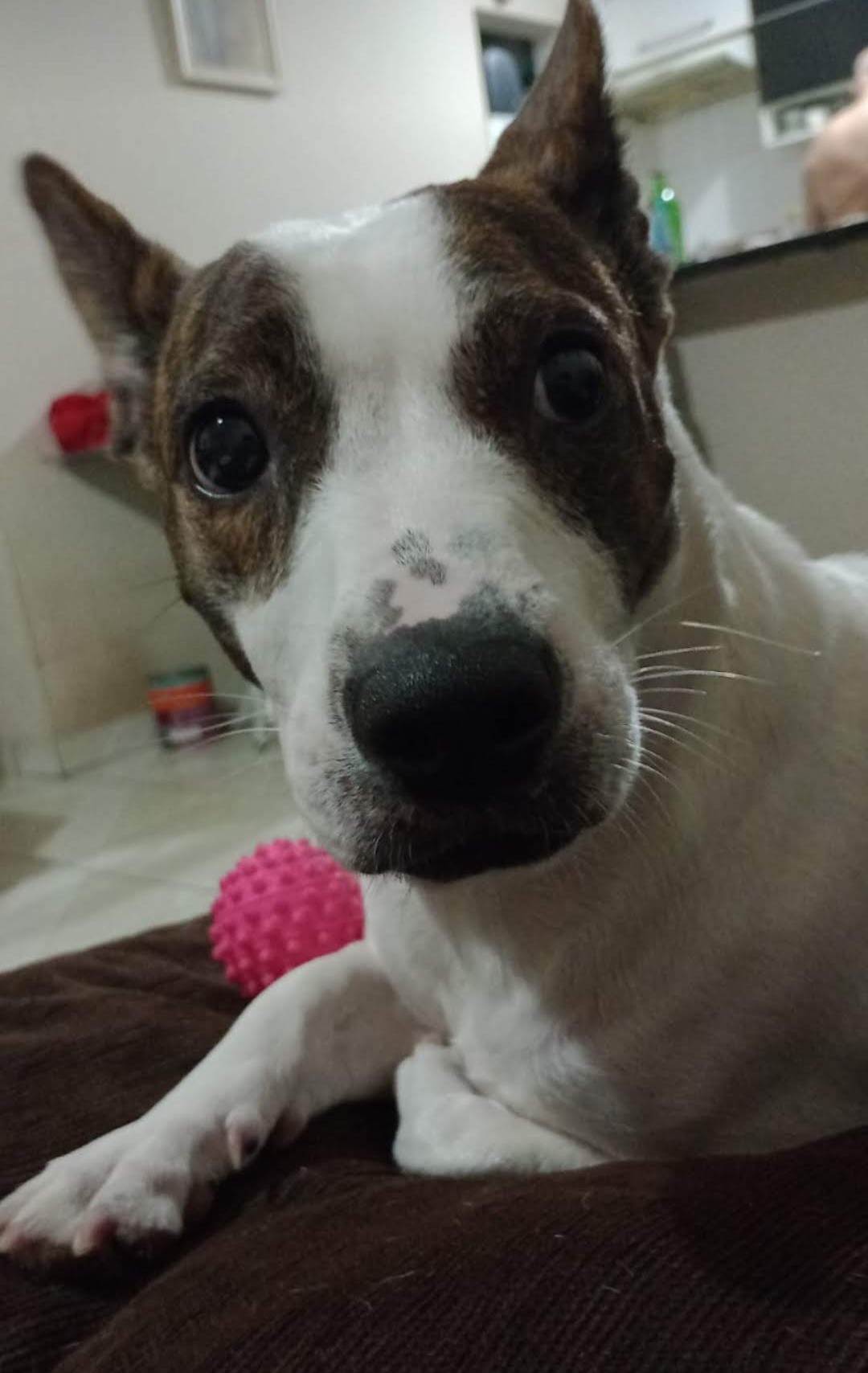 Mestiça Pitbull, parece com um Bull Terrie. E precisa de mais espaço ou alguém com tempo pra ela.