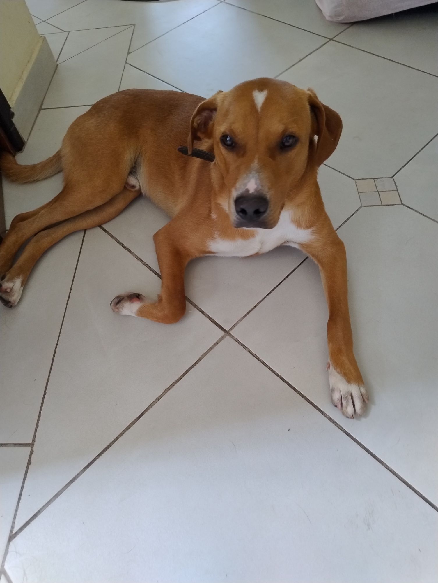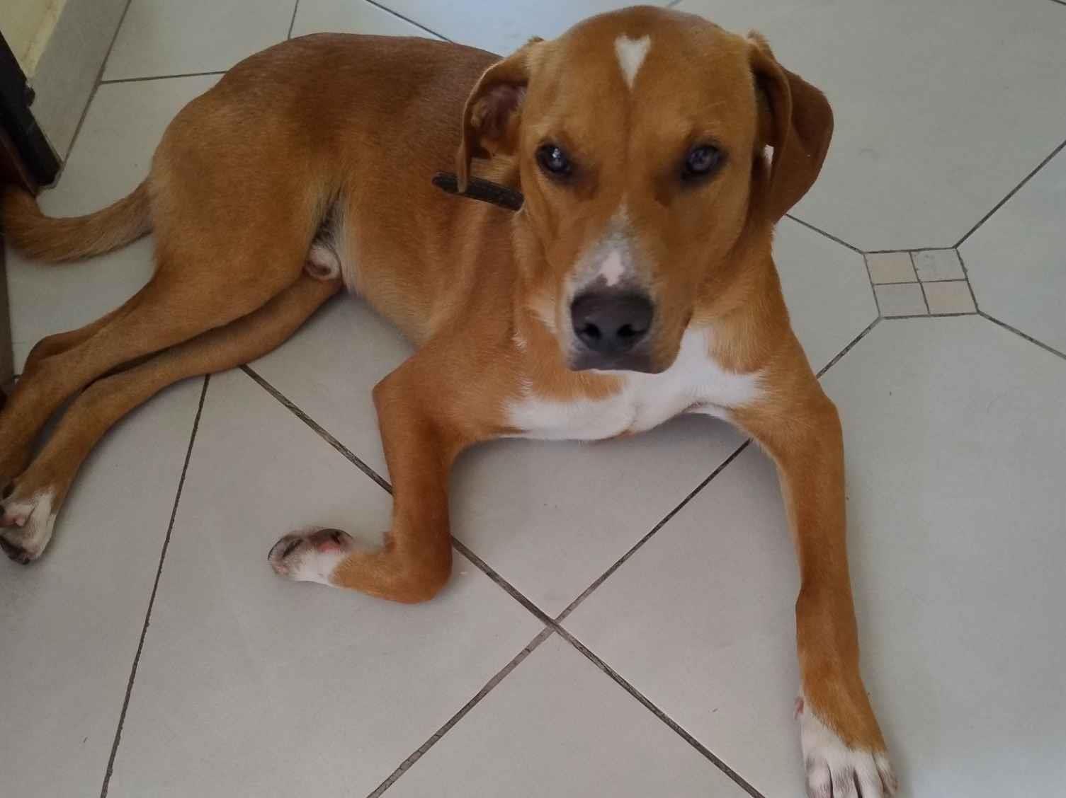 Ele apareceu na nossa rua, ficou mais de 1 mês na rua, alguem o abandou, demos abrigo para ele na nossa residência mas não podemos ficar com ele. É um cachorro dócil mas não podemos ficar com ele.