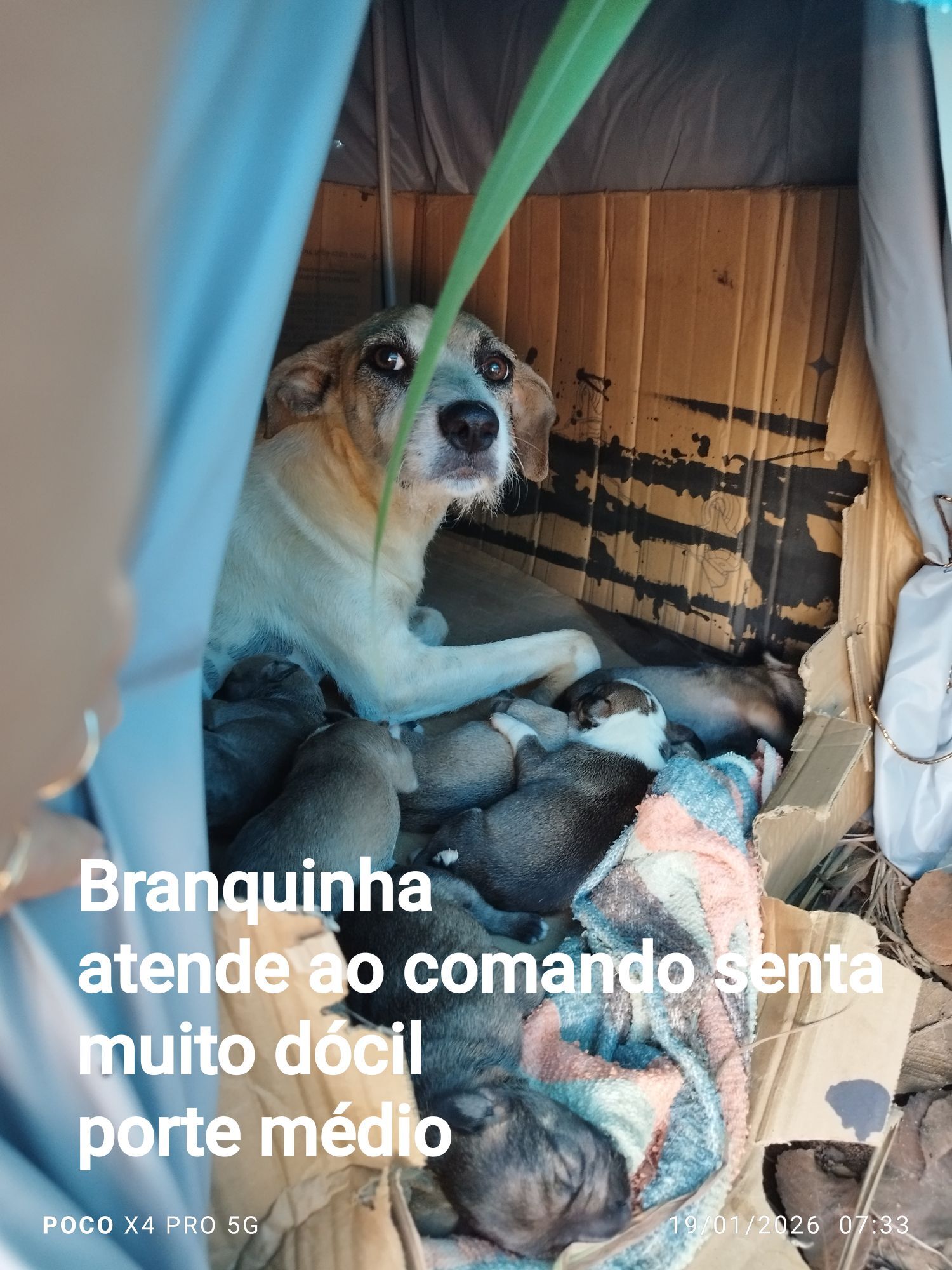 Foi abandonada grávida, no mato, próximo a 107 norte. Não tem pulgas, nem carrapatos e atende ao comando senta. Muito dócil, é muito fácil ganhar a confiança dela. Entrego castrada.
